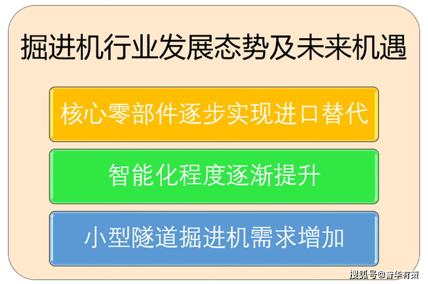 (1)核心零部件逐步实现进口替代 过去十年,我国生产的掘进装备及部件在进口替代方面取得了巨大进步,并且越来越多的关键部件在国内生产。在提升高端设备行业竞争力的政策推动下,中国隧道掘进机的整体国产化率预计将继续提高,预计行业内以铁建重工为代表的技术领先企业的市场需求将进一步扩大。 (2)智能化程度逐渐提升 随着如自动控制、故障检测和诊断、引导系统以及远程控制等智能化相关技术的发展,我国掘进装备行业的智能化程度不断提高。智能化技术的成功运用预计将显著改善能源效率、降低故障率、并提高施工精度,从而推进隧道掘进机应用于更复杂的地层及各类建设项目,有望进一步扩大隧道掘进机市场。 (3)小型隧道掘进机需求增加 当前日益增多的市政公用事业隧道建设项目,施工直径通常较小,且要求施工设备对周围环境影响尽量降低,为此制造企业正在积极开发小直径隧道掘进机以满足市场需求的变化。返回搜狐,查看更多 |